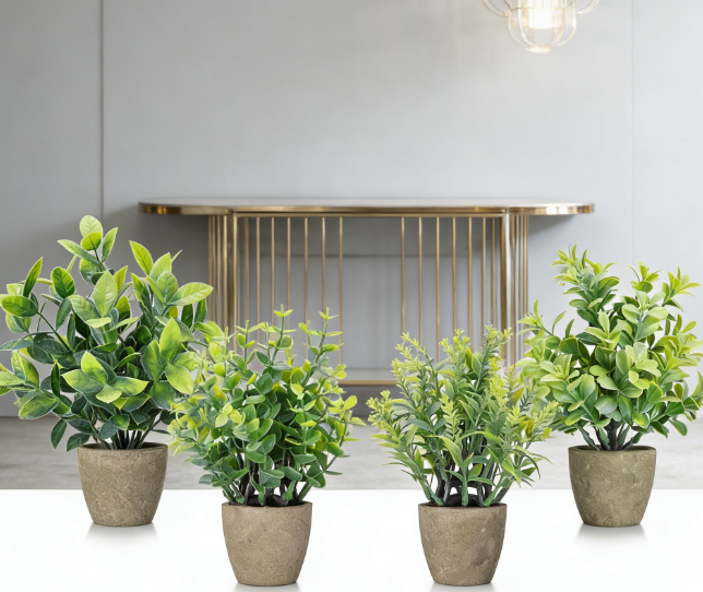 This set consists of four mini artificial plants, each housed in a ceramic pot. The plants feature small-scale greenery designs with petite leaves and natural coloring, presenting a minimalist overall aesthetic. The ceramic pots feature smooth surfaces and uniform coloring, allowing the set to be arranged together as a cohesive unit or used individually to accent different areas. Crafted with careful attention to the proportional harmony between the foliage and the vessel, each pot stands approximately 6 to 8 centimeters tall. Their compact size makes them ideal for placement on desktops, shelves, farmhouse-style decor corners, or bathroom countertops, requiring absolutely no daily maintenance.